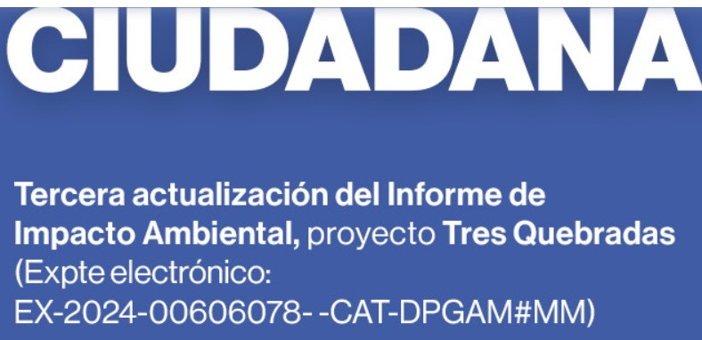 Desde el 9 al 31 de mayo de 2025 se lleva a cabo el proceso de PARTICIPACIÓN CIUDADANA, de la tercera actualización del Informe de Impacto Ambiental del proyecto de litio Tres Quebradas, etapa exploración, ubicado en el distrito Fiambalá, departamento Tinogasta; iniciado por la empresa LIEX SA, expediente electrónico EX-2024-00606078- -CAT-DPGAM#MM.